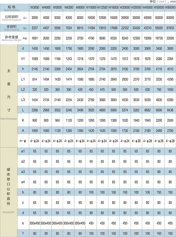 W3000L-W80000L臥式搪玻璃貯罐(臥式搪玻璃儲罐)設計圖紙及參數如下所示: