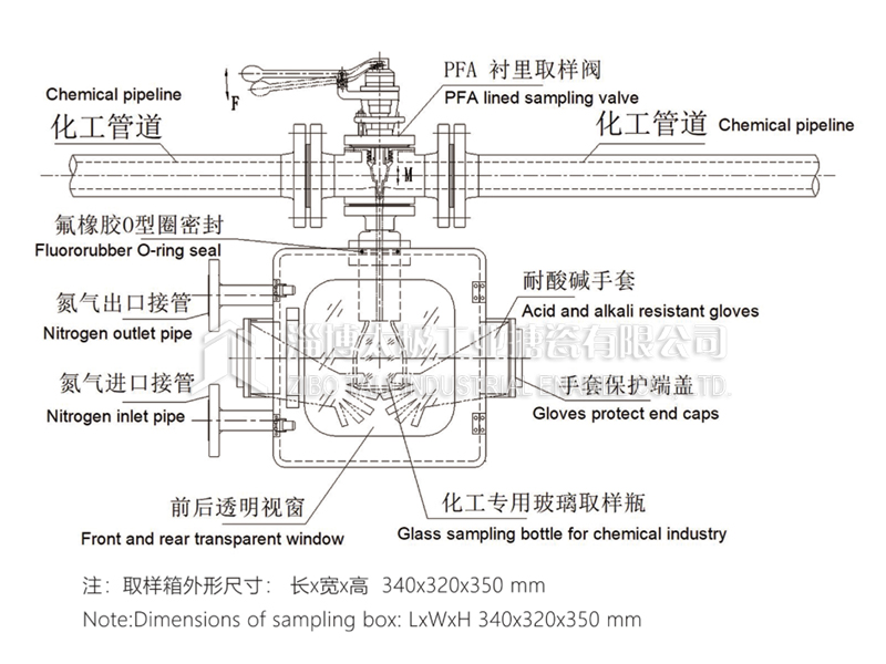 The PFA lined stainless steel sampling valve is installed above the Teflon glove box by a sealed connection. The Teflon glove box is equipped with a window door that can be quickly opened and closed in the operation direction, and a nitrogen inlet and outlet is set in the rear. After connecting the nitrogen gas source, the inside of the box and the space in the sampling bottle are cleaned. After the bottle body is installed stably, carefully press the top operation handle to make the medium flow into the sampling bottle gently and controlled. When sufficient medium is obtained, release the top press operating handle to make sure that the sampling process is stopped safely. The sampling bottle can be safely removed from the valve body by wearing acid and alkali resistant rubber gloves, and the sampling bottle cap can be installed. The nitrogen space can be cleaned again to further protect the operators. Finally, the sampling bottle can be taken out from the Teflon glove box to complete the process sampling.